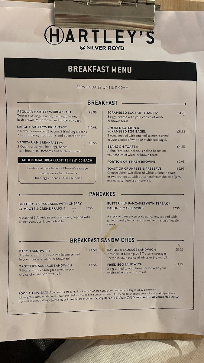 The menu at Hartley's is designed to cater to a variety of tastes, highlighting comfort food with a twist. For breakfast lovers, the Regular Hartley's Breakfast (£8.95) is a must-try; imagine perfectly cooked eggs, crispy bacon, and succulent sausages that set the tone for the day. If you’re in the mood for something lighter, the Scrambled Eggs on Toast (£4.75) paired with a rich cup of coffee will do the trick.